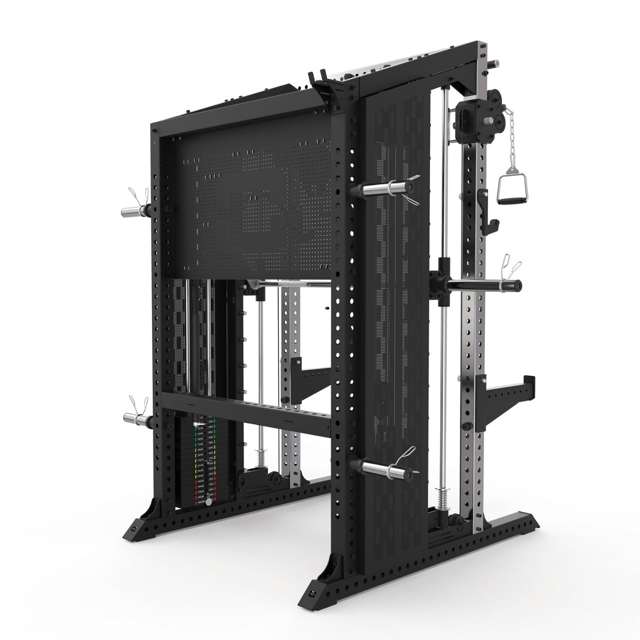 Ultra-smooth plastic pulleys, 2 J-hooks, 2 safety spotter arms, multi-grip chin-up bar, barbell storage, 4 weight plate holders for ø50 mm plates, and 6 Olympic spring clips (ø49 mm). Full attachment set: ankle strap, tricep rope, chain, 2 Y-handles, V-bar, short straight bar, straight bar, and curved bar. Optional non-slip metal footplate available.
