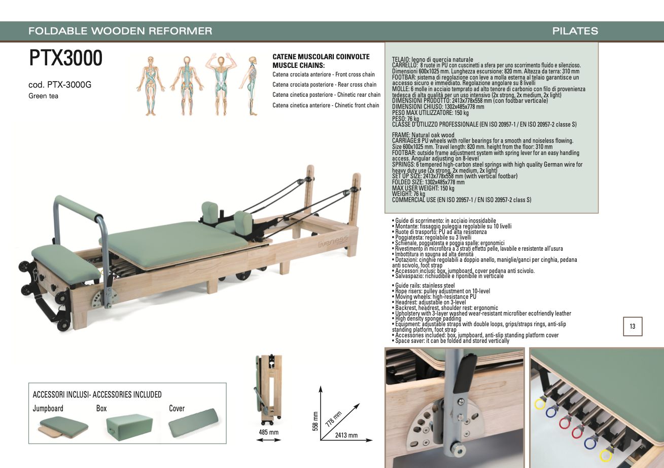 The Toorx PTX-3000G is a foldable, professional-grade wooden Pilates reformer, ideal for home studios and personal training where space is limited. Built from natural oak wood, it combines elegance, strength and smooth performance in a compact, space-saving design.