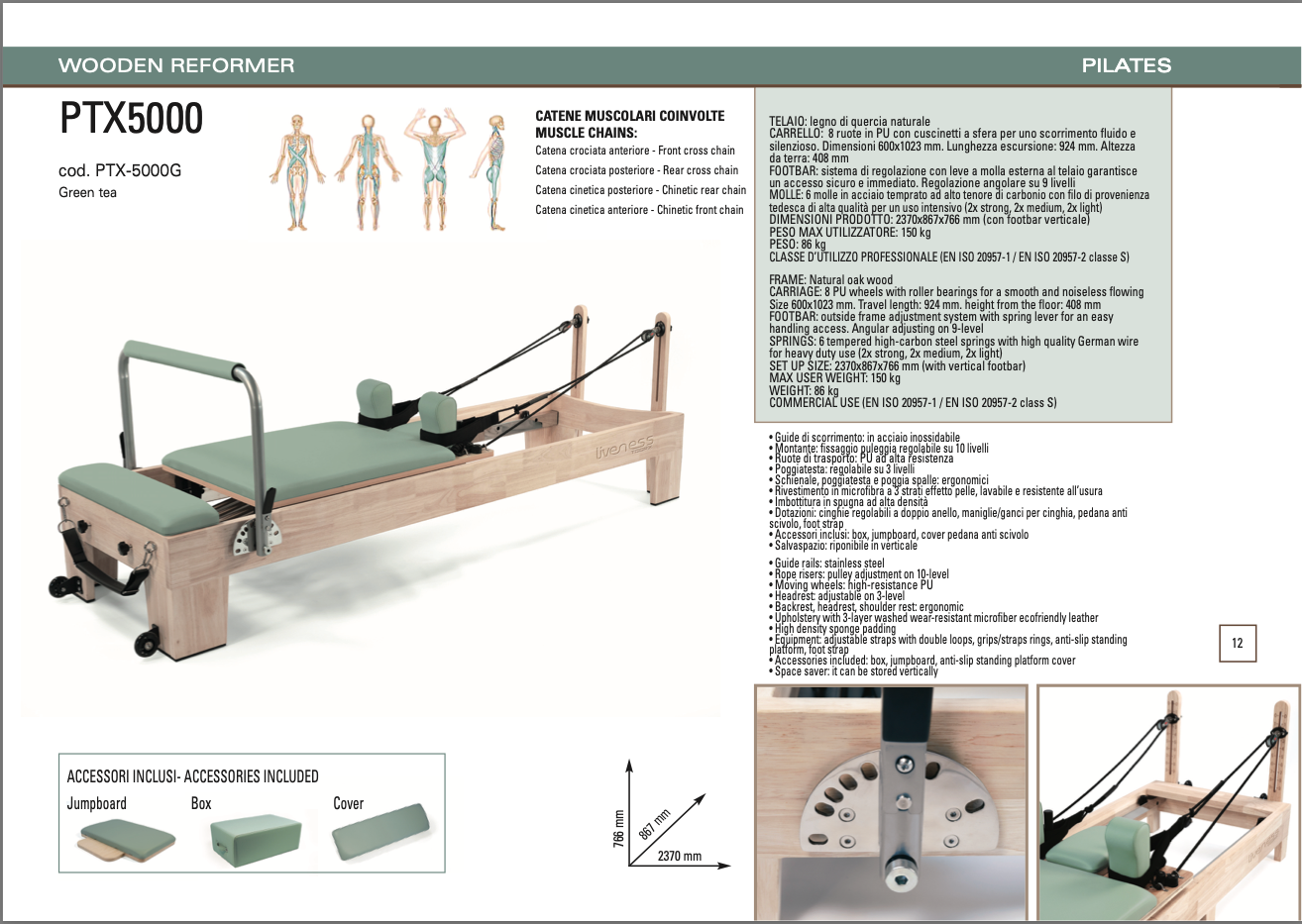 The Wood Reformer PTX-5000G is a versatile, professional-grade Pilates reformer designed to deliver a safe, effective, and elegant workout. Combining precision engineering, ergonomic comfort, and natural materials, it is suitable for home gyms, professional studios, and wellness spaces. Ideal for improving posture, strength, flexibility, and overall well-being, this reformer offers a full-body workout experience while respecting the natural dynamics of the body.